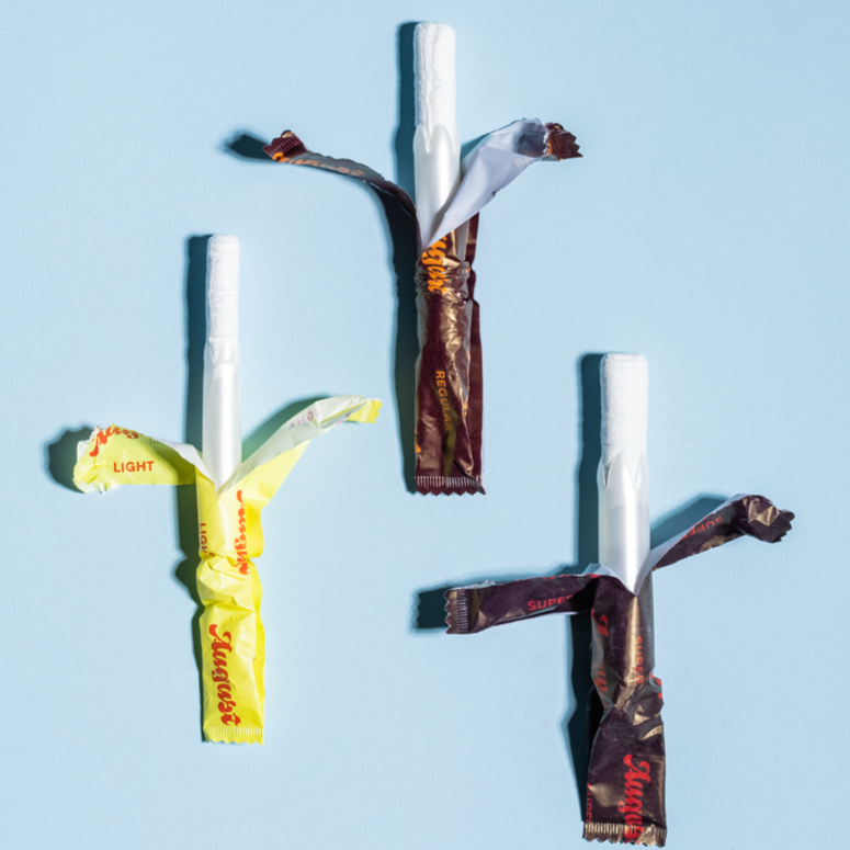 August tampons are 100% organic cotton and fully biodegradable. They are fitted with plastic long-applicators that are recyclable! Each “box” of tampons includes 8 tampon units.